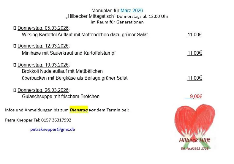 Jeden Donnerstag bietet "Hilbeck hilft" ein leckeres Mittagessen an. Gemeinsam schmeckt es ja bekanntlich besser! Im Anschluss wird bei einer Tasse Kaffee und einem Stückchen Kuchen (im Preis enthalten) noch ein bisschen geplauscht.